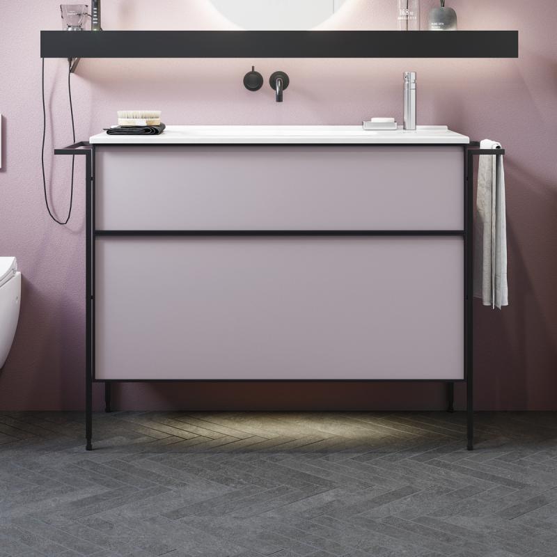 Dansani Inzo gir deg friheten og muligheten til å innrede baderommet ditt akkurat sånn det passer deg. Baderomsmøbel i valgfri farge med to skuffer med sort ramme. Bredde 100 cm inkludert Kantate porselensservant, og Corona Oval speil med lysstyring og sort Bubble LED-lampe. Refined støtteben fungerer som praktisk håndkleholder.