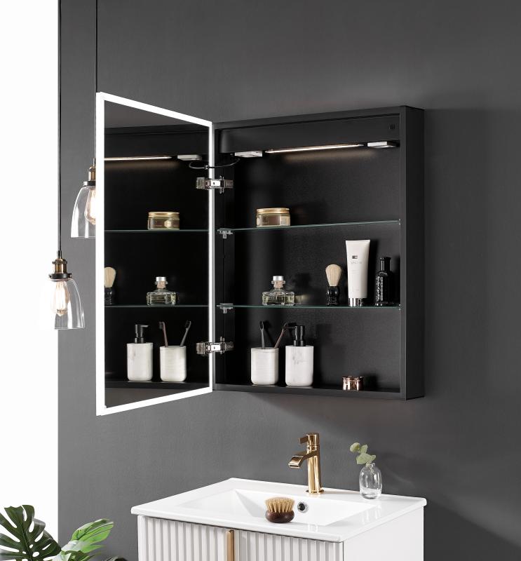 "Tidsriktig sort speilskap med LED belysning. Vi har utviklet Lucca sort speilskap med speil på innsiden av dør, justerbare glasshyller og 2 x stikkontakter med USB. Lucca har LED overlys, underlys, belysning i topp i skapet og LED belysning rundt hele speilkanten. Lucca speilskap har integrert Bluetooth? og høyttalere. Lucca speilskap har selvfølgelig vår unike sensor hvor du slår av/på, dimmer og fargejusterer - Alt dette ved KUN 1 x bevegelses sensor på undersiden av speilskapet. "Ingen fingermerker!" LUXE oppbevaringsboks for speilskap passer utmerket til Lucca speilskap."