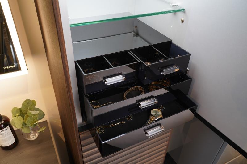 Luxe smykkeskrin får fin plass i Como Høyskap. Smykkeskrinet har 3 høyder med skuffer i varierte størrelser. Fin til smykker, klokker ogandre småting. Luxe smykkeskrin er også super å plassere på en kommode, benk eller garderobe.