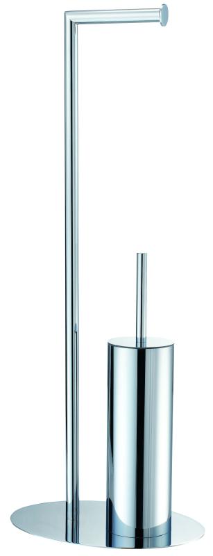 Frittstående toalettrullholder med toalettbørste i forkrommet stål. Produsert med oval fot. Høyde 71cm. Toalettbørsten har sort børsthode med nylonbust. Ekstra børstehode kan kjøpes separat.