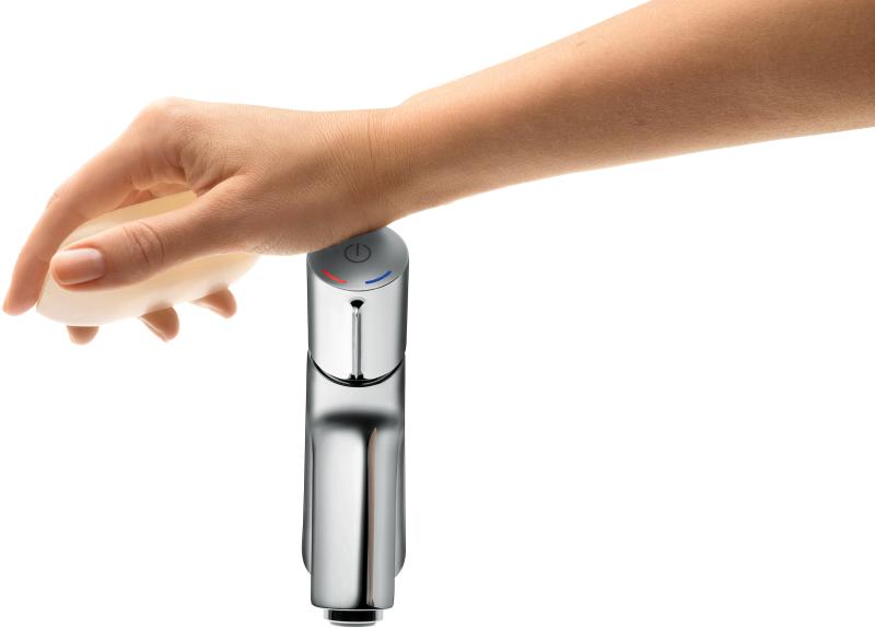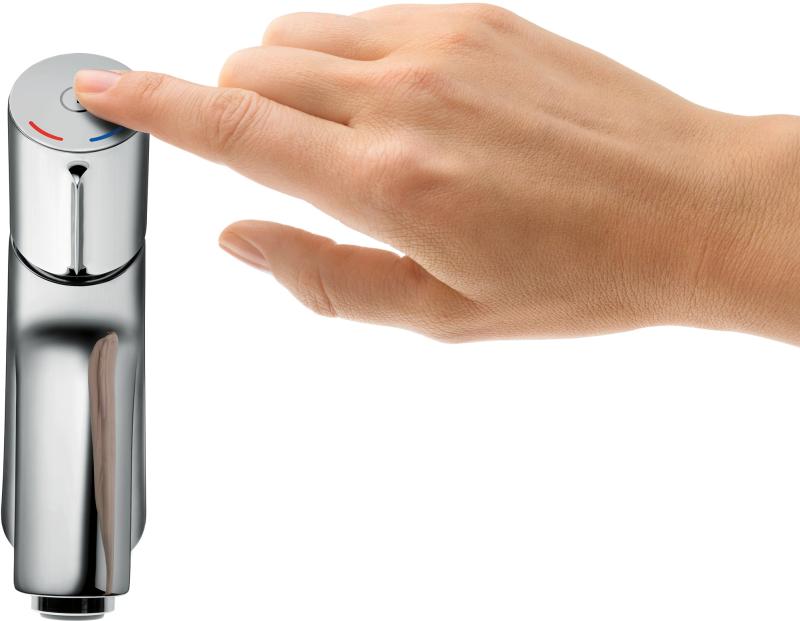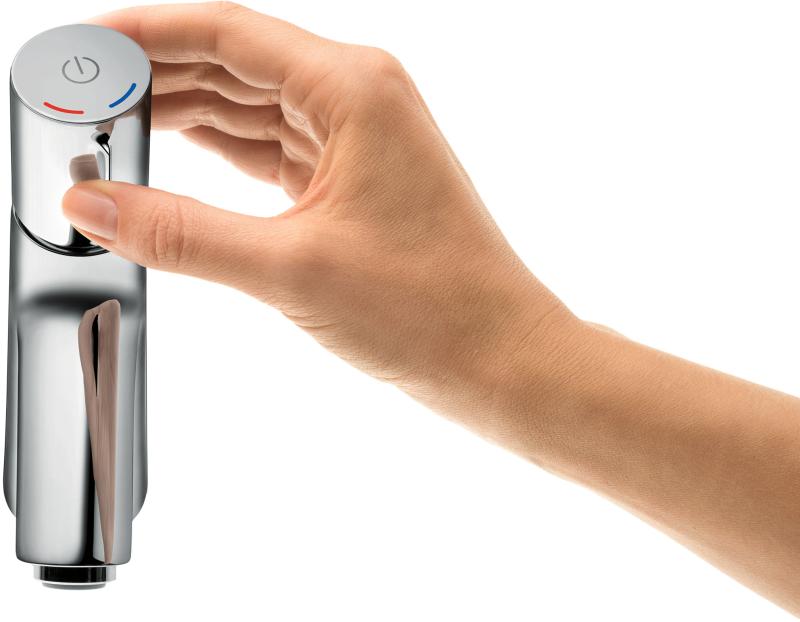 ComfortZone 100, overheng: 93 mm, tuthøyde: 98 mm, stråletype: Normal stråle, maksimal gjennomstrømningsmengde ved 3 bar: 5 l/min, Select-innmat med temperaturkontroll, justerbar temperaturbegrensning, passer til gass gjennomstrømningsvarmer, trykk på Select-knapp for å slå på/av vannet