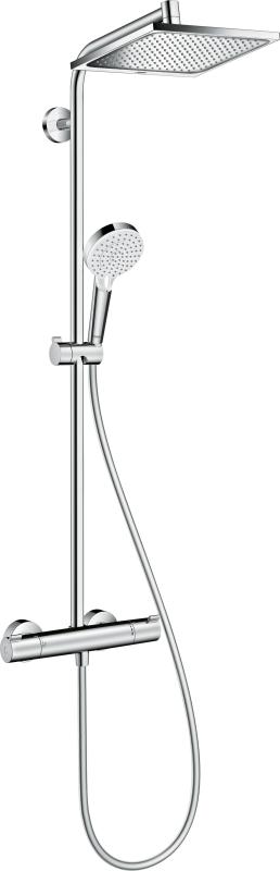 Det komplette dusjsystemet for allsidig dusjglede Dusjsystemet Crometta E 240 (1 jet) med termostat og hånddusj i krom har både en 240 mm bred takdusj og en hånddusj med justerbar dusjholder. Termostaten er utstyrt med SafetyStop, som forhindrer at temperaturen plutselig øker. Dusjens overflate er fullstendig forkrommet, og med QuickClean-teknologi er den enkel å rengjøre for kalk og smuss. Andre funksjoner , Hodedusjen har stråletypen RainAir med en gjennomstrømningsmengde på 16 l/min ved 3 bar., Hånddusjen er 100 mm i diameter og har to stråletyper: Rain og IntenseRain., Termostaten sørger for at vanntemperaturen er konstant med en SafetyStop-sikkerhetssperre på 40 °C., Driftstrykk: min. 1,2 bar / maks. 10 bar., Dusjbendet er 350 mm., Garantert tilgjengelig: Hansgrohe lagerfører reservedeler i hele 15 år etter at produktet er utgått.