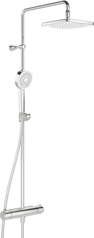 Nye Nova Style, en moderne rain shower med myke kubistiske former. Dusjsystem med termostat. Takdusj 200x200 mm og hånddusj 95 mm. Dusjkranen er utstyrt med skåldesperre 38°C på temperaturratt samt mengderegulering med EcoFlow. Tak- og hånddusj er utstyrt med silikondyser, som er enkle å holde rene på grunn av anti-kalk teknologi.