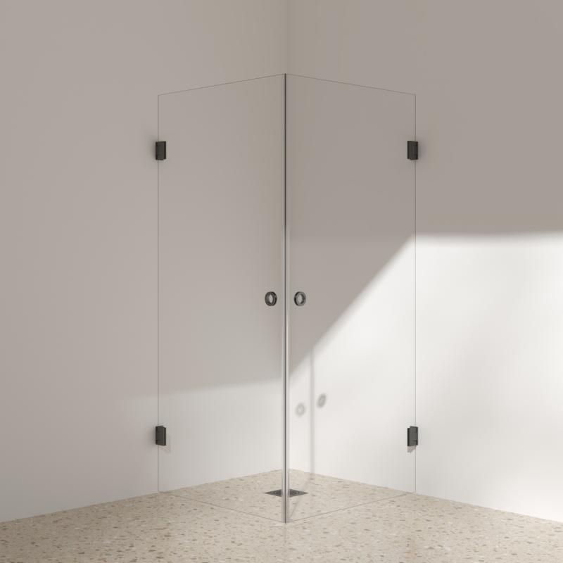 Silvano Dusjhjørne med klart glass fåes med henglser og fingergrep i 8 utvalgte overflater. Velg mellom: Børstet Stål, Bronse Matt, Gunmetal, Kobber Børstet, Gull Blank, Gull Børstet, Krom eller Matt sort til samme pris. Våre dusjvegger er laget i 8mm sikkerhetsglass og har dobbelsidig nano easyclean for enklere renhold. Settet inkluderer 2 stk dusjdører komplett med henglser og fingergrep samt magnetlister. Mål: 90x90x200cm *Subbelist medfølger ikke men fåes i transparent eller sort. *Varenummer gjelder Klart glass med hengsler og fingergrep i Gunmetal