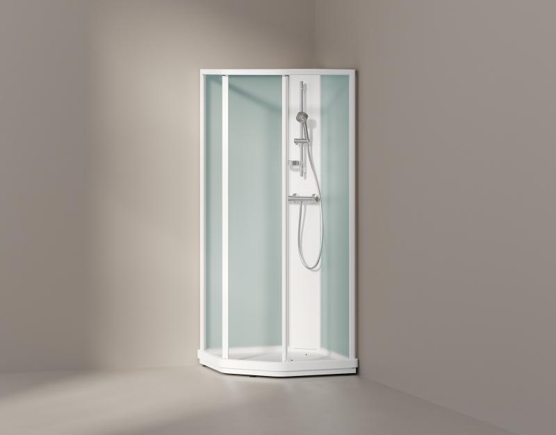 Dusjkabinett i 6 mm glass med hvite profiler og klart glass i front for et sobert utseende. Frostede bakvegger som skjuler eventuelle rør på baksiden. Dusjsett er inkludert, men ikke blandebatteri. Artikkelnummeret gjelder str. 900x900 mm. Finnes også i 800x900 mm venstre/høyre, 700x900 mm venstre/høyre samt 1000x1000 mm. Høyde 2120 - 2140 mm til øvre kant ramme. Kabinettet har regulerbare ben.