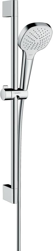 Dusjsett i høy kvalitet for en mer behagelig dusj. Dusjsettet Croma Select E Vario virker pleiende mot huden og har detaljer som gjør dusjopplevelsen fantastisk. Knappen som brukes til veksle mellom stråletypene med ett trykk, er plassert i umiddelbar nærhet på dusjhodet (Select). Sammen med hånddusjen inneholder det komplette settet en Unica-dusjstang og en 1,6 meter lang dusjslange. Høyden til glideren kan justeres på dusjstangen (0,65 m), og vinkelen kan endres med inntil 45°. Få mer variasjon når du dusjer Med hele tre stråletyper blir dusjopplevelsen mer variert (3jet): Rain, IntenseRain og TurboRain. Stråletypen Rain gir deg en dusjregnopplevelse uten like ? perfekt når du vil gi håret en grundig vask. IntenseRain-strålen treffer kroppen med ren kraft og skyller bort alt hverdagsstresset. TurboRain-strålen har en intens oppkvikkende effekt, og nytes best med full vanngjennomstrømning. Den tidløse, elegante utførelsen passer sømløst inn i et moderne bad. Den hvite stråleskiven på hånddusjen skaper en fascinerende kontrast mot den krombelagte overflaten. Den interne vanngjennomstrømningen hindrer også at det ergonomiske grepet blir varmt, uansett hvor lenge du står i dusjen. En sil fanger opp alt smusset før vannet når frem til dusjhodet for økt varighet. Andre funksjoner , Lett å rengjøre: Kalk og smuss fjerner du enkelt ved å tørke av silikondysene på dusjhodet (QuickClean), Nyt økt bevegelsesfrihet med den 1,6 meter lange dusjslangen laget av plast med metalloverflate. Et spesielt monteringssett hindrer krøll på dusjslangen, Allsidig i bruk: Hånddusjen er egnet for gjennomstrømningsvarmere, Lett å montere: Dusjslangen kan skrus fast til en eksisterende tilslutning på et øyeblikk (størrelse: G 1/2)