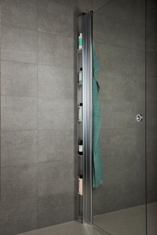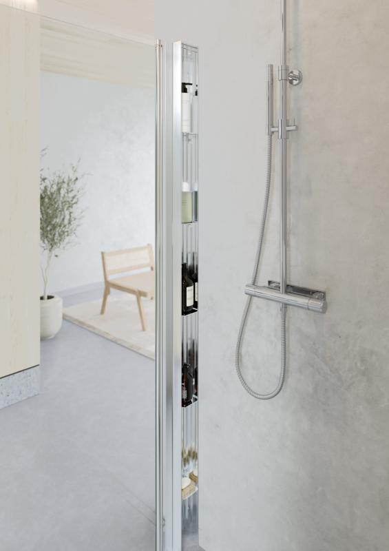 PILE er en dusjoppbevaringsløsning som smelter sammen med dusjløsningene i LINC-serien både når det gjelder design og funksjon. Resultatet blir en dusjoppbevaring på dusjens innside som takket være sin høyde på 2000 mm enkelt rommer alle sjampo- og såpeflaskene til hele familien. Praktisk håndkleknagg på utsiden. PILE bygger 100 mm på avstanden fra veggen. Trekk derfor fra 100 mm dusjens yttermål eller bredde når du bestiller. Fås i samme finish som profilene til LINC; Polished, Matte Brushed, Matte White og Matte Black. Artikkelnummeret gjelder Polished (blank krom).