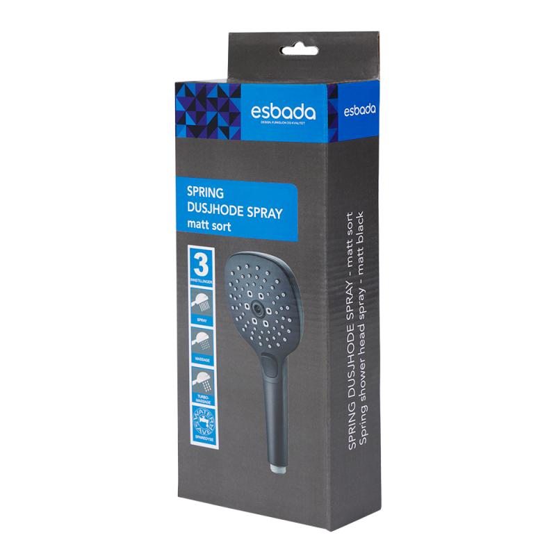 "110 x 110mm dusjhode i matt sort utførelse og 3 innstillinger. Stråletypen velges med trykknapp. Universal 1/2" tilkobling, passer til de fleste dusjslanger. Ved bruk av medfølgende sparedyse reduseres vannforbruket med ca 30%"