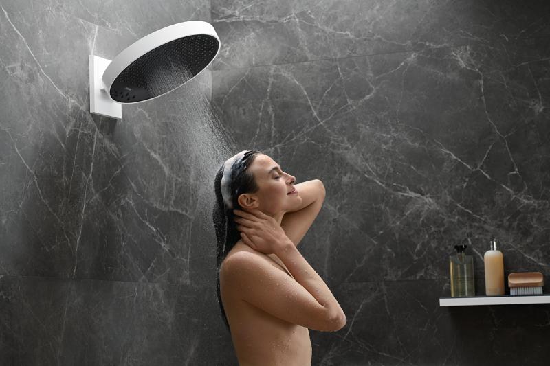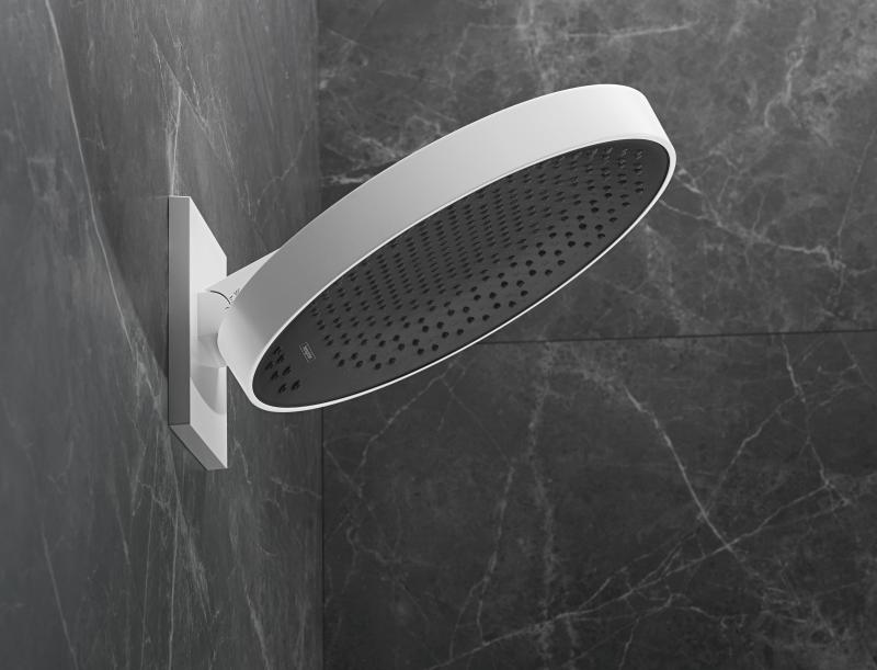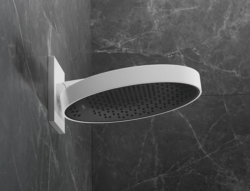 Nyt spaopplevelsen i ditt eget hjem med tre stråletyper: Regndusj i vakre farger med matt hvitt og antrasitt Regndusjen Rainfinity 360 3jet med veggtilslutning i matt hvitt er ekstra stor (360 mm diameter) og virker pleiende med tre stråletyper: Intense PowderRain har en mer konsentrert stråle med mikrofine vanndråper som gir sensasjonell nytelse; RainStream lar deg nyte spaopplevelsen i eget hjem; og PowderRain omfavner kroppen med tusenvis av mikrofine vanndråper (3jet). Stråletypen avgjør vannforbruket ? maks 20 l/min for PowderRain, maks 16 l/min for RainStream og maks 18 l/min for Intense PowderRain (ved 3 bar). Du kan også holde håret tørt mens du dusjer, ved å endre retningen på vannstrålen med det justerbare dusjhodet. Den tofargede hodedusjen med slitesterk kvalitetsoverflate i matt hvitt, og den antrasittfargede stråleskiven i eloksert aluminium med innovervendt form, skaper en avslappende aura på badet. Sammen med andre Rainfinity-produkter kan alle med sans for interiørdesign skape sitt helt egne unike bad. Enorm dusjnytelse med alternativer for praktisk rengjøring Kalkavleiringer fjerner du ganske enkelt ved å tørke lett på silikondysene på dusjhodet (QuickClean). Ved behov kan hodedusjen også fjernes før rengjøring. Ekstra praktisk: Vinkelen på hodedusjen kan justeres vertikalt mellom 10?30° slik at du kan holde håret tørt om nødvendig. , Montering på iBox: Hodedusjen monteres på iBox universal-innbyggingsdelen fra hansgrohe (nr. 01800180), Stort vannfall: Nyt det 360 mm store dusjhodet for jevn og luksuriøs vanngjennomstrømning (XXL Performance)