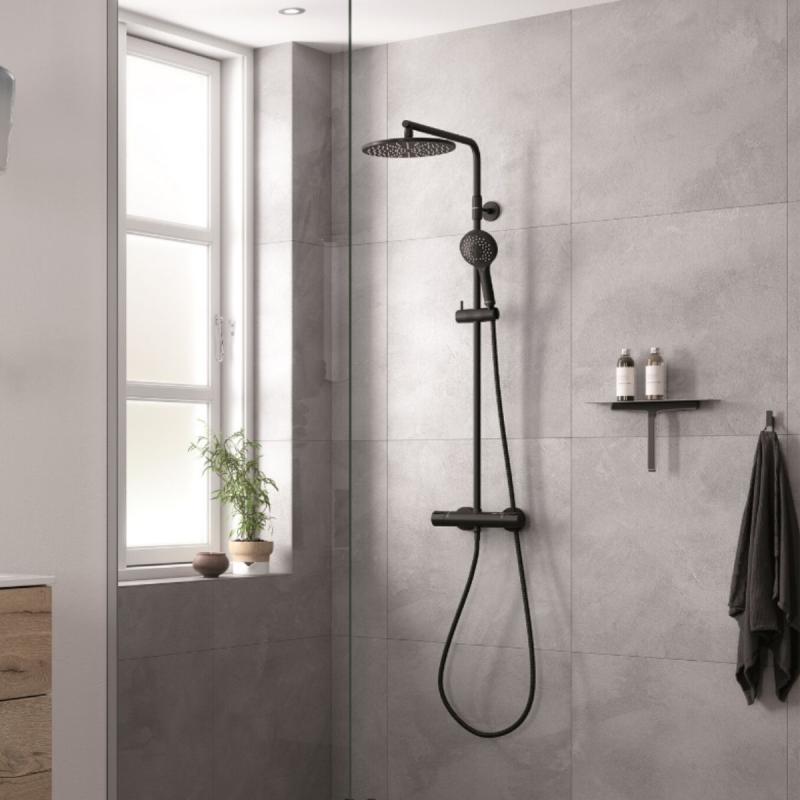 Komplett takdusj med 250mm takdusjhode. Hånddusj med 110mm dusjhode og rubcelan. Justerbar stang 1020-1250mm. Vender mellom kaldt og varmt vann i termostatkranen. Skoldesperre.
