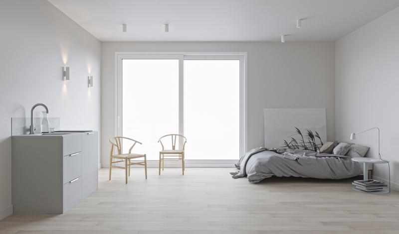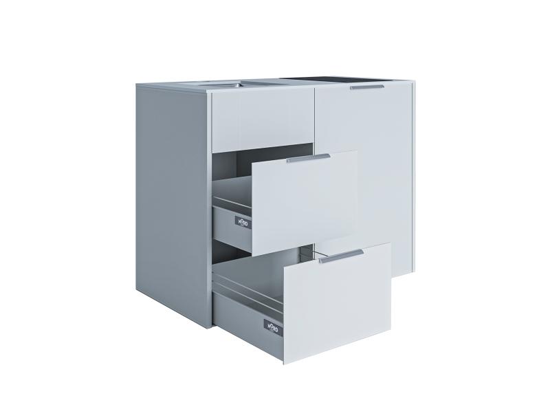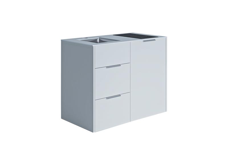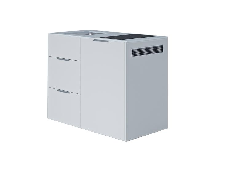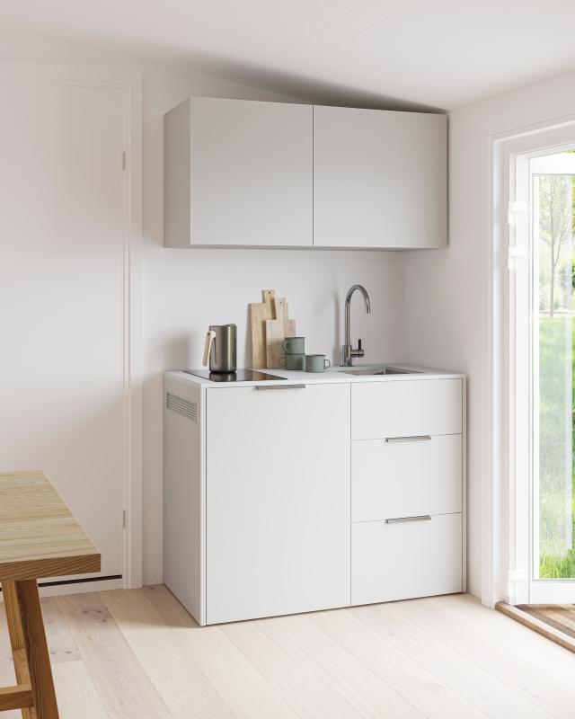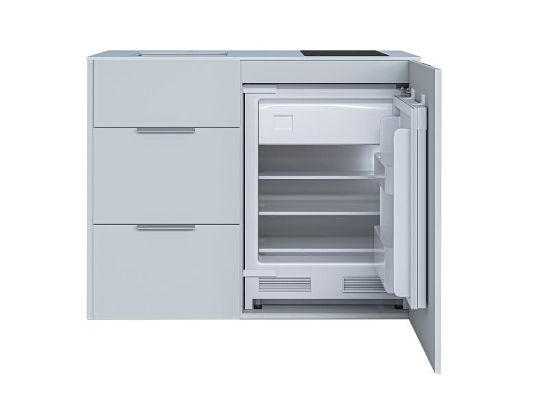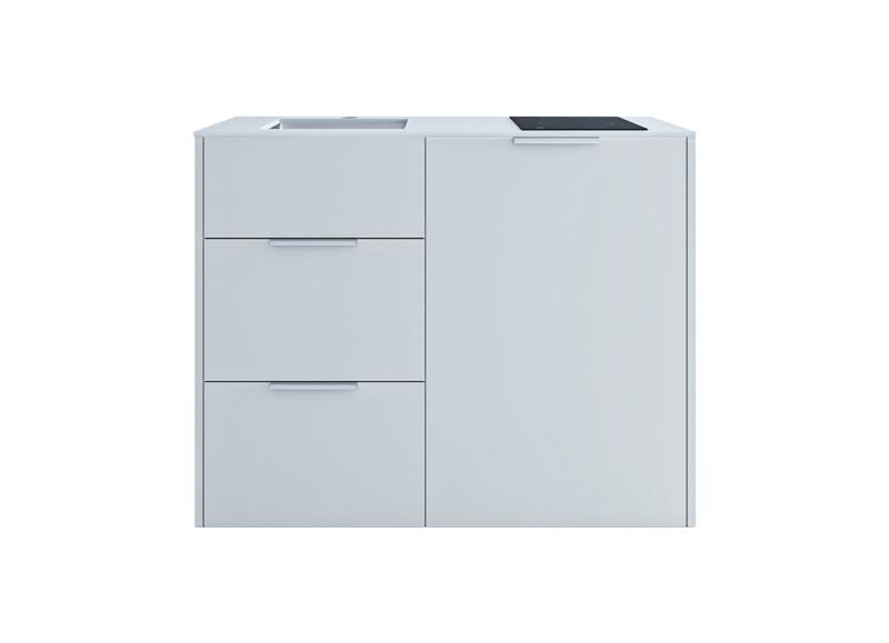 Design minikjøkken, Oslo, Lys Grå. Inneholder kjøleskap m/frysedel, induksjonstopp 2 soner, underlimt moderne kjøkkenvask, to romslige skuffer med soft-close.