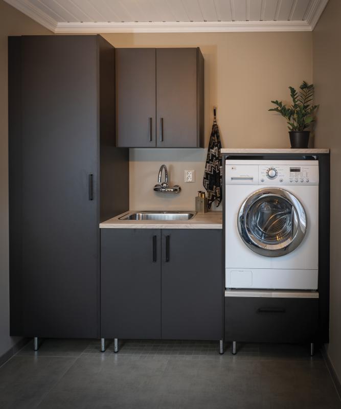 Vaskeromsinnredning med høyskap B50 med hyller. Underskap med med hyller og to dører B80. Benkeplate B80. Overskap B60 med hyller og to dører. Underskap med skuff B60 H29. Benkeplate B60. Dekksider x2 (på hver side av vaskemaskin) B60 H119. Benkeplate B634. Støtteben. tilgjengelig i Hvit, Grå og Sort matt.