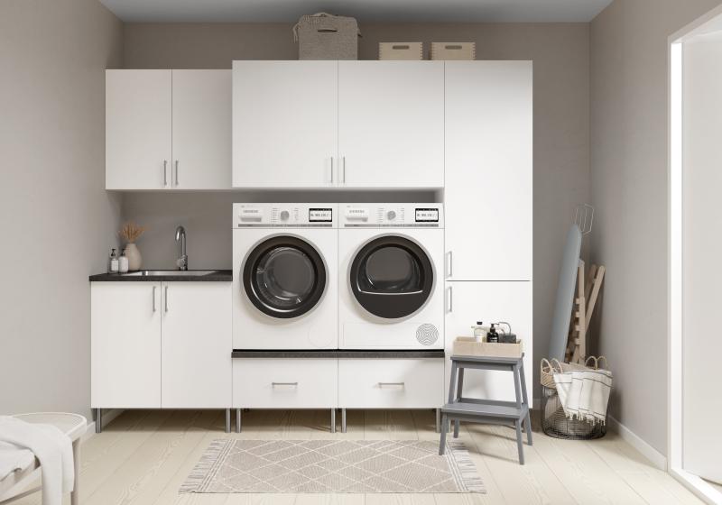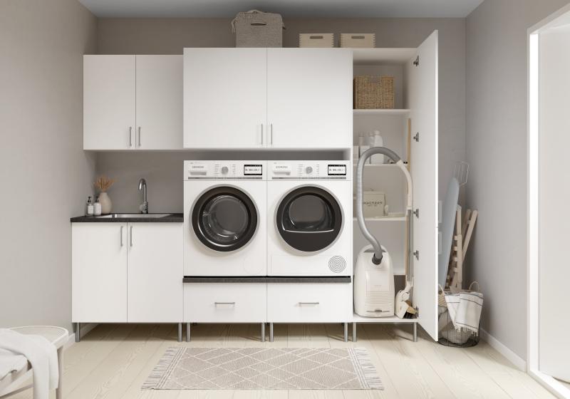 Skap i full dybde over vaskemaskin og tørketrommel gir masse plass på små rom. Skuff under vaskemaskin og tørketrommel løftar klesvasken i arbeidshøgde. Bra for deg, godt for ryggen din! Kosteskap med kortere hyller gir god plass til oppbevaring av langkoster og støvsuger. Benkeplate i fargen SKIFER. Vaskerom i Kvit matt vist i 250 cm breidde.