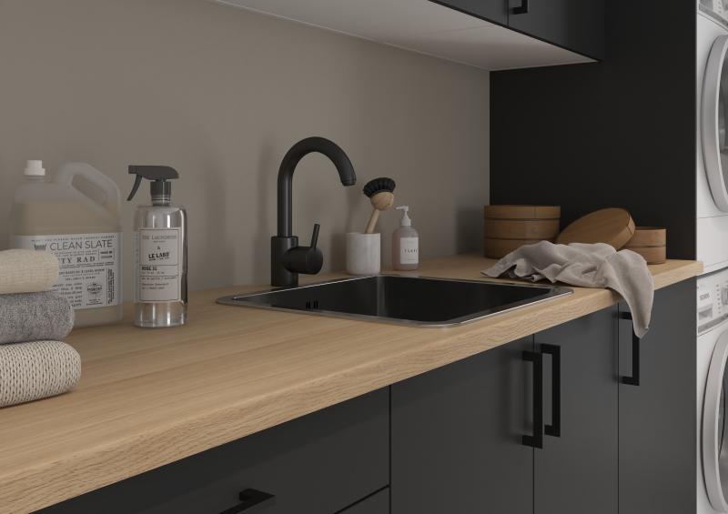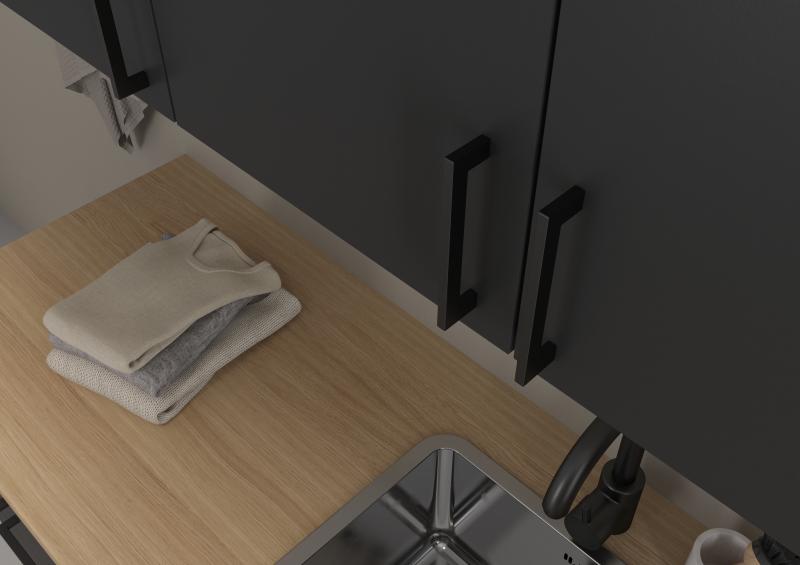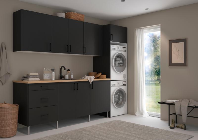 Vaskerom vist i Svart matt i 260 breidde. Vaskemaskin og tørketrommel satt oppå kvarandre for å utnytte plassen godt. Skap over vaskemaskin og tørketrommel gir bonusplass til mindre rom. Overskap over heile benkeplata gir mykje plass til oppbevaring. Benkeplate i farge EIK.
