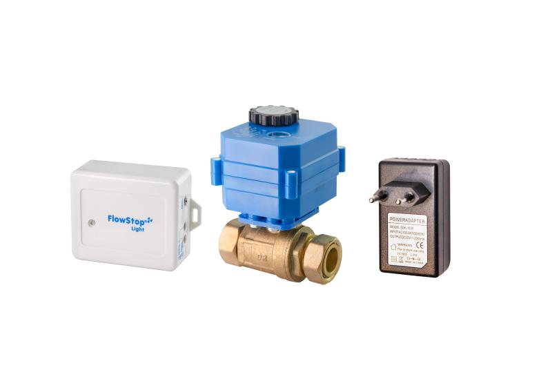 FlowStop Light består av 1 hovedsentral, 1 aktuatorventilventil, 1stk sensorkabler Når sensorledning kommer i kontakt med vann vil det samtidig sende et signal til hovedsentral og ventilen vil stenge vannet automatisk.